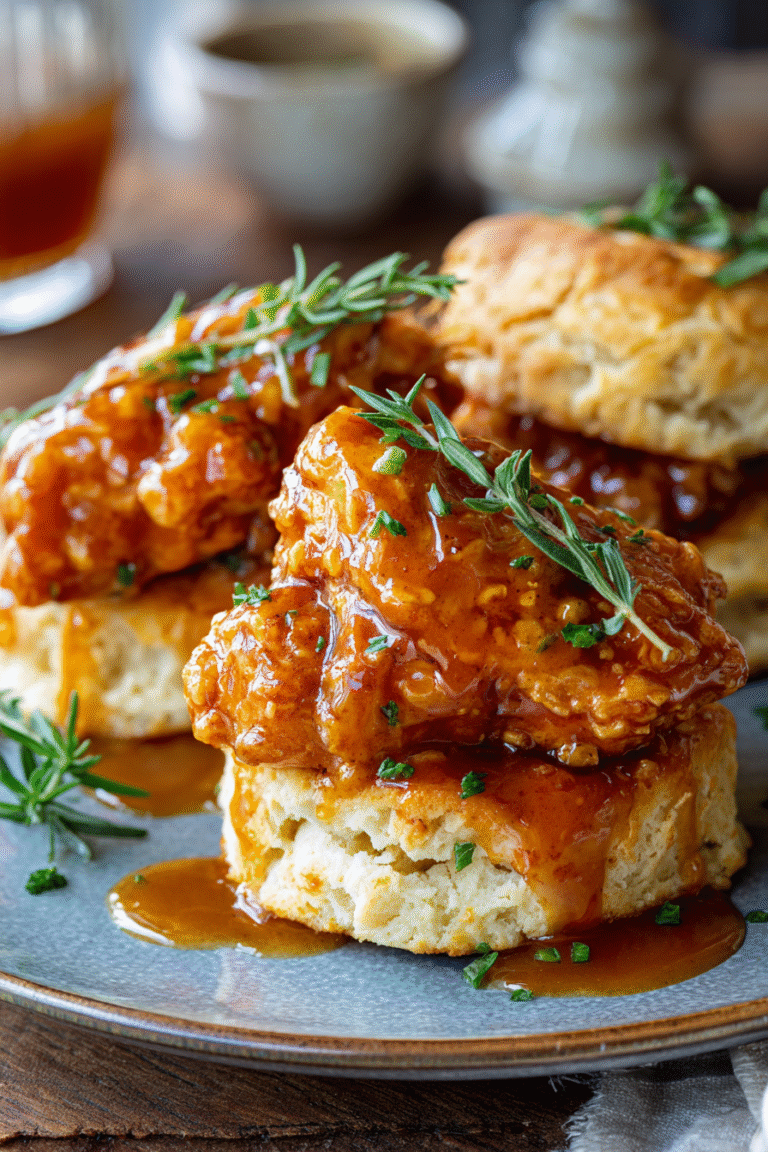 Once the chicken and biscuits are cooked, let the chicken cool slightly before tossing gently in the hot honey glaze. Serve the glazed chicken nestled in or atop the warm, fluffy biscuits. Drizzle any remaining glaze over the top for an extra touch of sweet heat. Transfer to plates and enjoy.